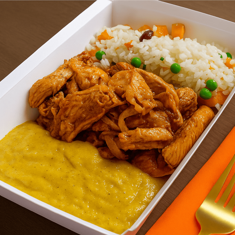 Iscas de frango com arroz integral e creme de milho