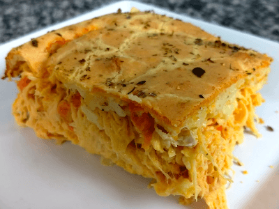 Torta integral recheada com frango desfiado e requeijão light, acompanhada com arroz integral e mix de legumes.